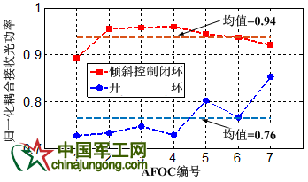 圖2 相控陣分孔徑在傾斜控制開、閉環(huán)下的光纖耦合接收效率實驗結(jié)果