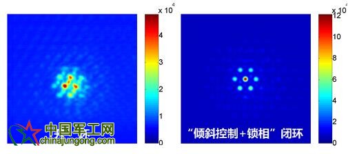 圖3 七單元光纖激光相干組束的傳輸控制實驗結(jié)果(遠(yuǎn)場)