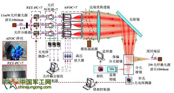 日前,中科院光電技術(shù)研究所自適應(yīng)光學(xué)重點實驗室李新陽、耿超課題組在光纖激光相控陣技術(shù)研究方面取得新進(jìn)展:以雙向收發(fā)的自適應(yīng)光纖準(zhǔn)直器為基礎(chǔ)模塊,構(gòu)建了整體口徑100 mm的七單元激光收發(fā)陣列(光纖激光相控陣),于湍流環(huán)境下實現(xiàn)了光纖激光的相干組束和高效傳輸控制。該研究中,通過對信標(biāo)光的分孔徑自適應(yīng)耦合接收,實時校正各單元孔徑發(fā)射激光傳輸路徑上的波前傾斜像差;將以上方法與光纖激光陣列的主動鎖相控制結(jié)合,實現(xiàn)了室內(nèi)模擬動態(tài)湍流下七單元激光束于遠(yuǎn)場的相干合成。實驗中所用的核心像差校正器件—自適應(yīng)光纖準(zhǔn)直器(AFOC)和壓電光纖相位補(bǔ)償器(PZT PC)均為自適應(yīng)光學(xué)重點實驗室課題組自行研制,并已獲得6項相關(guān)發(fā)明專利的授權(quán)。相關(guān)研究成果以李楓為第一作者發(fā)表于IEEE Photonics Journal 和 IEEE Photonics Technology Letters。