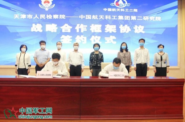 天津市檢察院政治部主任王德群與航天科工二院副院長朱弘分別代表雙方簽約