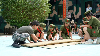 此次夏令營中,莒口鎮武裝小院精心策劃了 “疊軍被” 展示與體驗、無人機吊裝水球模擬滅火演示、“穿越火線” 接力賽等豐富互動環節。