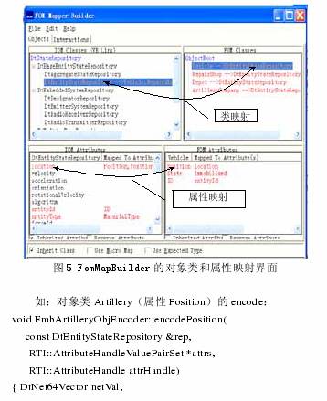 進行FONI映射主要是為f將基于RTI的應(yīng)用轉(zhuǎn)化為.y層應(yīng)用(如一維顯示、數(shù)據(jù)}o}放、=位場景等),這一工作我們采用NLVK的VR-Link 來實現(xiàn),VR-Link是針對HLA的獨仁于協(xié)議的.高層應(yīng)用程序接日。‘自提供丁圖形化工具FomMapBuilder(圖5)}習守用戶定義的包含對象類及屬性、交互類及參數(shù)的FED(聯(lián)邦執(zhí)行數(shù)據(jù))文件,與VR-Link定義的獨}i:于協(xié)議的對象類及屬性、交互類及參數(shù)進行映射。VR-Link采用丁面向?qū)ο蟮腃十十實現(xiàn),使用FomMapBuilder完成映射后將自動生產(chǎn)FONI映射代碼,代碼,},還包含丁對對象類屬性、交互類參數(shù)的編碼 (encode)和解碼(decode),以使RTI信息能被基于VR-Link的.高層應(yīng)用所識別。