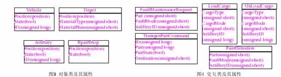 維修保障仿真系統(tǒng)FOM,的對象類包括火炮類Artillery、車輛類Vehicle、修理機構(gòu)類RepairShop和倉庫類Depot C圖3);交互類主要包括故障維修請求類FaultMaintenance、故障狀況類FaultSituation ,裝載貨物類LoadCargo ,卸載貨物類UnLoadCargo、運輸故障部件命令類TransportFaultPartCommand(圖4)等C III于篇幅所限,這里只列出部分分交互類)。