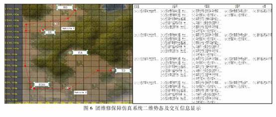 一維勢態(tài)顯示主要是將仿真過程及成員以圖形化方式顯示出來,開發(fā)工具采用丁NLVK公司的PVD和VR-Link, PVD以實時提供淺場的一維勢態(tài)圖,并顯示實體、聚合和傳感器;VR-Link是快速建仁HLA應(yīng)用、面向?qū)ο蟮腃十十工具包,使開發(fā)主要集中用于仿真應(yīng)用而需要考慮網(wǎng)絡(luò)協(xié)議的細節(jié)。圖6為團維修保障仿真系統(tǒng)的一維勢態(tài)及交互信息顯示,其實現(xiàn)過程如下: