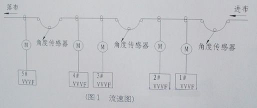 在降低變頻器成本的基礎上實現五臺電機同步調速,1號、3號、5號電機要求能自動隨張的變化大小,達到布的松緊始終一致。2號電機要求能夠實現瞬間調速功能,即用手按下快進或慢進按鈕,頻率會立即加快或減慢幾Hz,松開按鈕能回到原來的頻率繼續運轉,4號電機通過外部電位器可以微調。(見圖1)