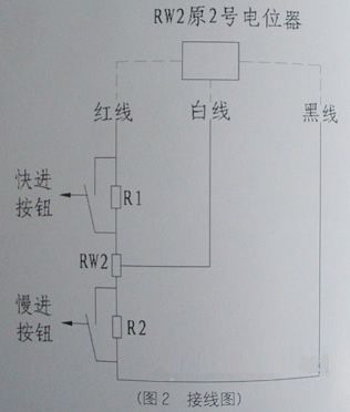 現場采用的張力控制為一角度傳感器,實質就是一個電位器當面布的張力發生變化引起角度改變,輸出電阻值也隨落布之變化,經測試電阻值為5.6K。功率1w,以角度傳感器替代同步控制器上相應的電位器即去掉同步控制器上1號、3號、5號變頻對立的電位器,從角度傳感器引三根線至相應的電位器接線處。4號電機調速仍采用同步控制器,原來的電位器只需將同步器輸出端引至變頻器V2、V3即可。2號變頻器因需加快進、快慢功能,接線稍麻煩,利用在電位器兩端串電阻的方法實現瞬間調速,具體接線見圖2。