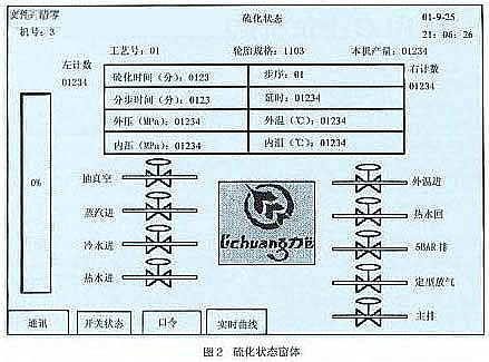 在軟件的編程過程中,人機界面(MM,)非常重要,因為它直接與操作員產生信息交流,友好的人機界面要求能真實再現控制設備的狀態以及準確的采集所需參數的數據,這主要依靠VB 6.0的控件組合及原代碼完成。整個人機界面包括硫化狀態畫面(主畫面)、實時曲線畫面、數據查看畫面、歷史曲線畫面、工藝編輯畫面、報警畫面、口令畫面、開關狀態畫面,各畫面間可以相互切換。當然也可根據用產習慣編輯不同的人機界面,具有很好的靈活性。