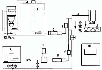 1.絮凝劑自動投配系統;2.加藥泵;3.電磁流管計.4.臥螺離心機;5.無軸螺旋輸送機;6.污泥池;7.污泥切割機;8.污泥進料泵;9.電磁流管計;10.電控系統