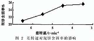 在臥螺離心機轉速一定的前提下, 通過改變差轉速來分析其對泥餅含固率的影響。因為差轉速與排渣量的大小有直接關系, 故從所取料樣中選取進機污泥固體總量比較接近的一組數據來討論比較符合實際。其結果見圖 2。