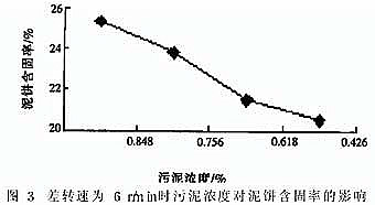 2) 在臥螺離心機操作參數一定時, 泥餅含固率隨污泥濃度的降低而降低。