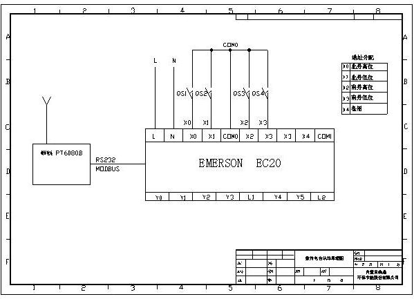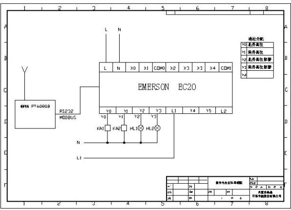 采用一臺(tái)EC20-1006BRA作簡(jiǎn)單的繼電連鎖,除了和舊系統(tǒng)進(jìn)行連鎖(互鎖),還有變頻器的簡(jiǎn)單啟動(dòng)和停止及報(bào)警。本系統(tǒng)還另外裝有一臺(tái)EC20-1006BRA,通過(guò)串口與一臺(tái)數(shù)傳電臺(tái)相通訊(MODBUS),來(lái)實(shí)現(xiàn)和另外一個(gè)水泵房(凈環(huán)泵房)實(shí)現(xiàn)連鎖。當(dāng)璇流井有高液位報(bào)警時(shí),通過(guò)PLC及數(shù)傳電臺(tái)傳送到凈環(huán)泵房,由操作人員確定水泵的啟動(dòng)和停止(由于二者距離太遠(yuǎn),且不適合電纜敷設(shè),所以采用無(wú)線(xiàn)數(shù)傳的方式)。 其中璇流井內(nèi)PLC設(shè)置為主站,凈環(huán)內(nèi)PLC為從站。數(shù)傳電臺(tái)采用深圳科立訊生產(chǎn)的PT6080無(wú)線(xiàn)數(shù)傳電臺(tái)是利用先進(jìn)的單片機(jī)技術(shù),無(wú)線(xiàn)射頻技術(shù),數(shù)字處理技術(shù)設(shè)計(jì)的功率較大,體積較小的模塊式半雙工數(shù)傳電臺(tái),采用SMT新工藝,選用高質(zhì)量的元器件。抗干擾能力強(qiáng),精致堅(jiān)固,結(jié)構(gòu)緊湊,安裝方便。數(shù)話(huà)兼容,數(shù)傳可優(yōu)先。RS232、RS485及TTL多種接口可供選擇,適應(yīng)面寬。參見(jiàn)下面原理圖: