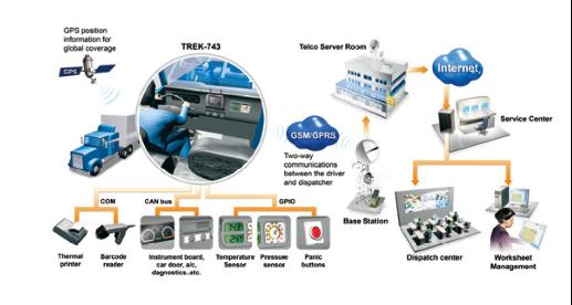 TREK-743,集成7’’ 高亮度LCD/觸摸屏、嵌入式一體化車載終端。操作系統支持WinCE/XPE,安裝,布線非常簡單,體積小巧,適宜安裝在駕駛室等有限空間。司機透過車載終端TREK-743 友好的用戶界面,以及穩定可靠的GPRS 無線通訊 ,與調度中心實現有效的日常工作互動。